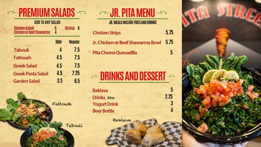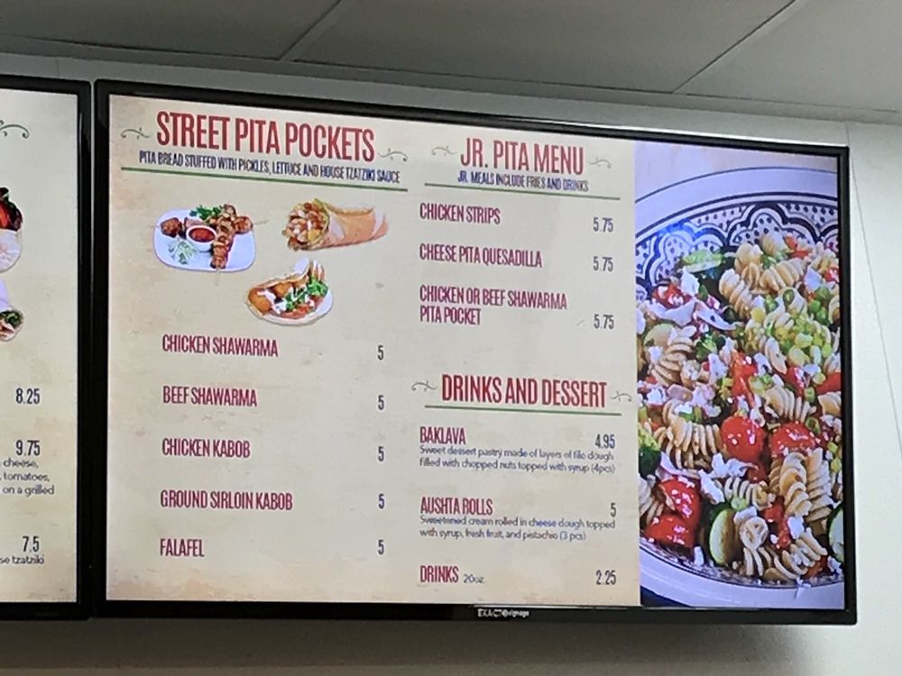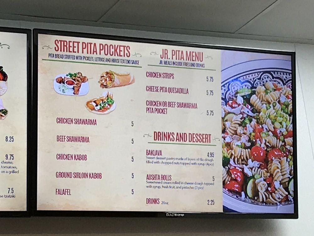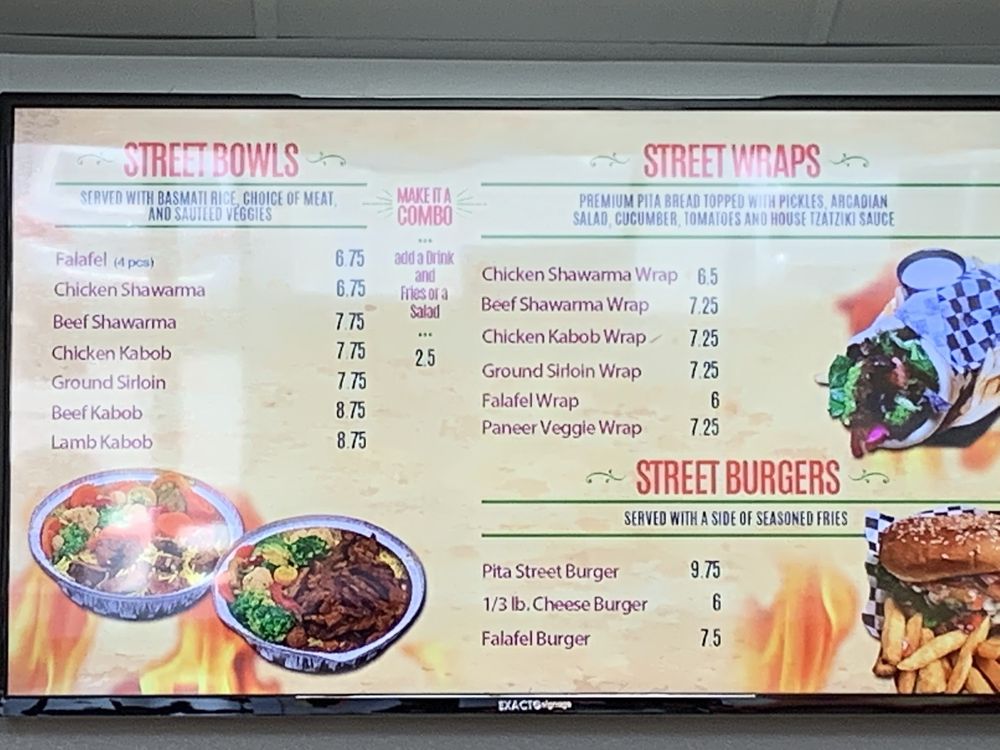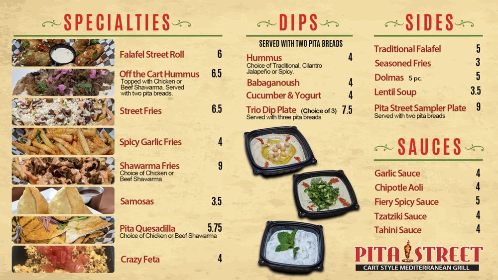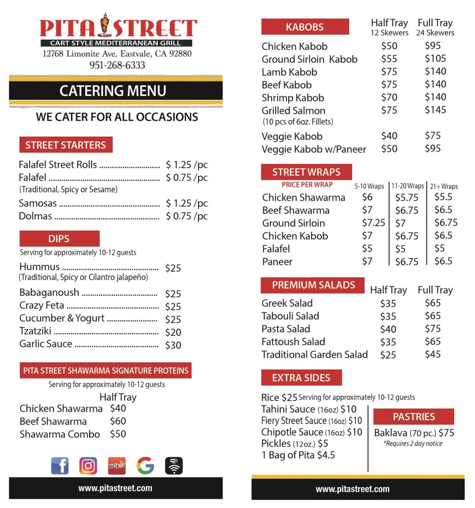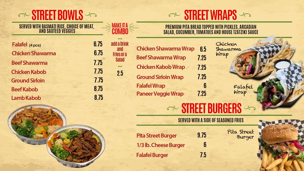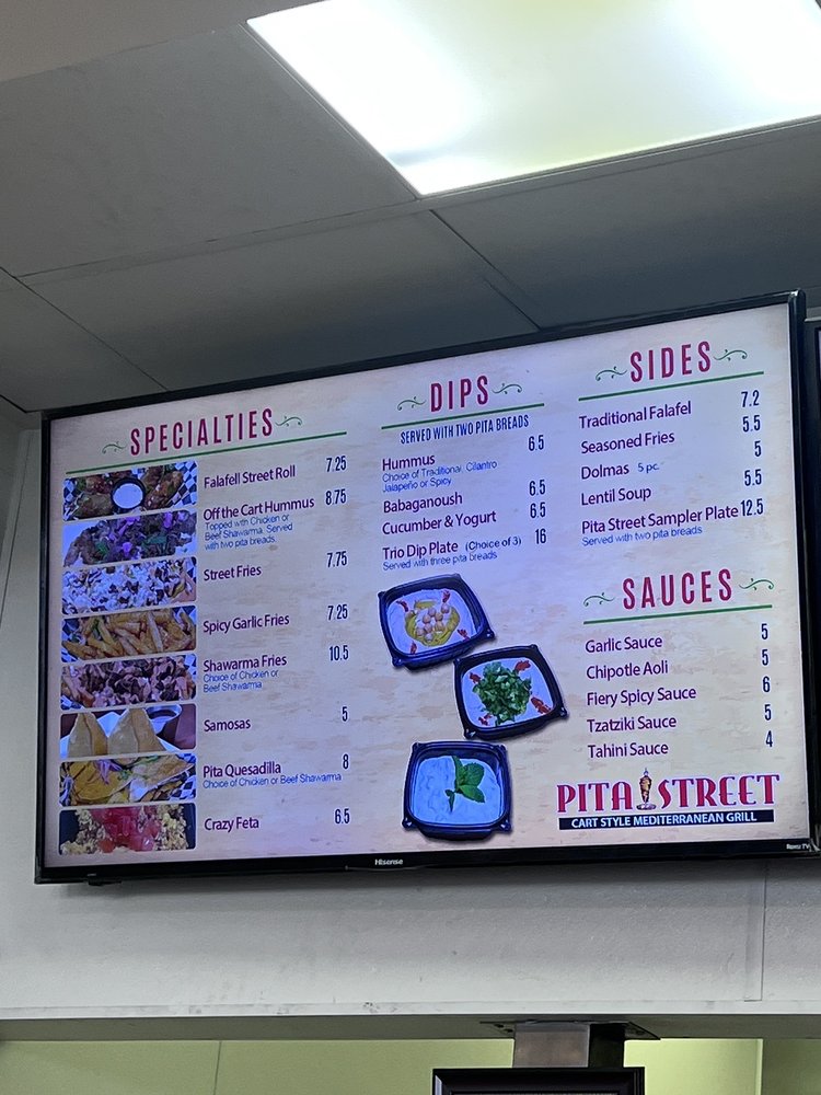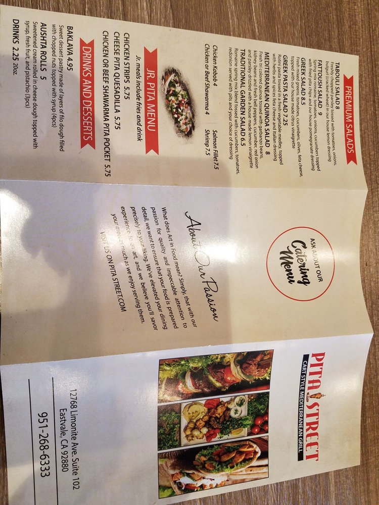 Introducing the menu at Pita Street, a Mediterranean restaurant located in Eastvale, CA. Offering a wide range of options including Street Starters like Falafel Street Roll and Street Fries, Street Platters with dishes like Chicken Shawarma Plate, Beef Shawarma Plate, and Shawarma Combo Plate, as well as Street Wraps and Burgers featuring Beef Shawarma Wrap and Chicken Shawarma Wrap. Customers rave about the generous portions, flavorful food, and friendly service. The restaurant also offers vegan and vegetarian options, catering, outdoor seating, and happy hour specials. Diners can enjoy dishes made with fresh ingredients and delicious sauces like tahini and garlic paste. Pita Street is a must-visit for those craving authentic Mediterranean flavors in a clean and modern setting.